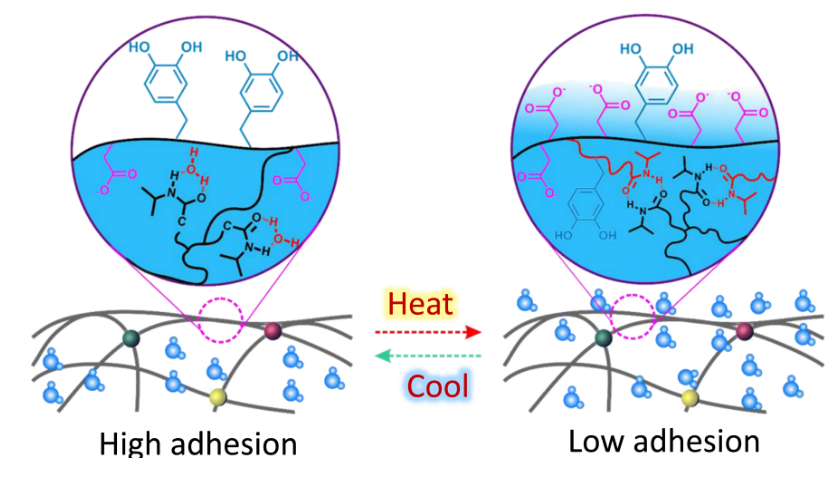 這項(xiàng)突破并非一蹴而就。周峰回憶,幾年前,團(tuán)隊(duì)一直攻關(guān)高強(qiáng)韌黏附水凝膠材料,偶然發(fā)現(xiàn)一種材料在多次按壓后黏性驟降?!霸摤F(xiàn)象引發(fā)了我們的極大興趣,經(jīng)過(guò)對(duì)材料的成分分析、機(jī)理驗(yàn)證等,才知道原來(lái)在多次按壓以后,手部溫度傳遞到凝膠表面,致使凝膠發(fā)生相變,呈現(xiàn)低黏附態(tài)?!边@讓團(tuán)隊(duì)意識(shí)到,溫度可能是調(diào)控黏附性能的鑰匙。