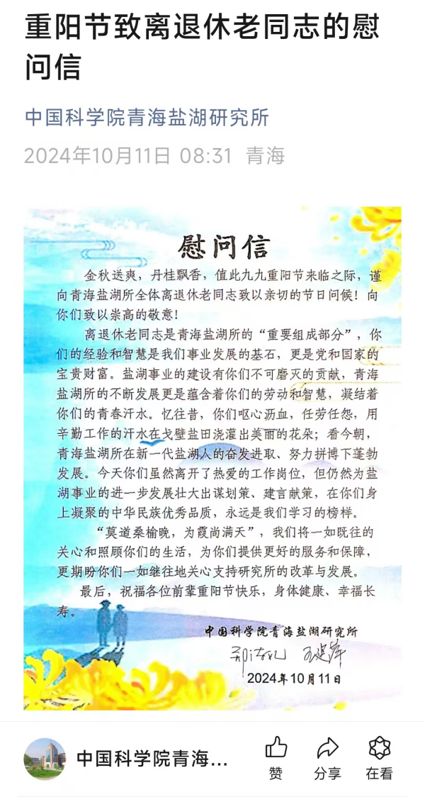 10月11日,在一年一度的重陽佳節(jié)來臨之際,為弘揚中華民族尊老、敬老、愛老、助老的優(yōu)良傳統(tǒng),中國科學(xué)院青海鹽湖研究所組織開展了重陽節(jié)關(guān)愛慰問系列活動,讓離退休職工在屬于他們的節(jié)日里感受組織的關(guān)心和節(jié)日的快樂。