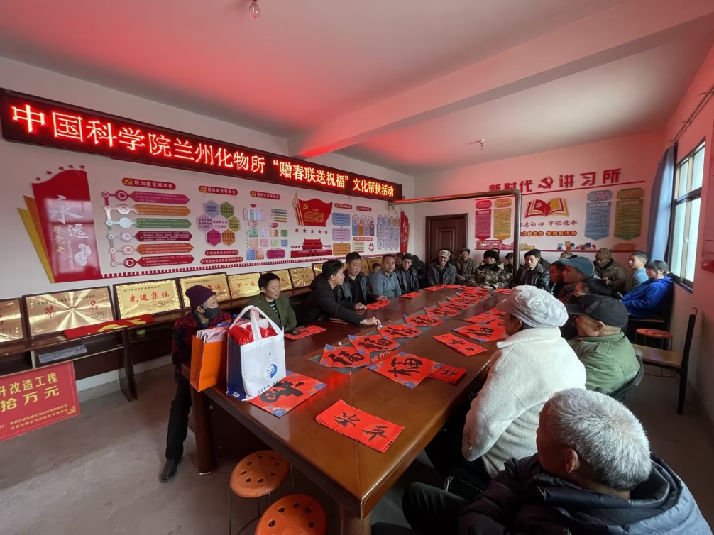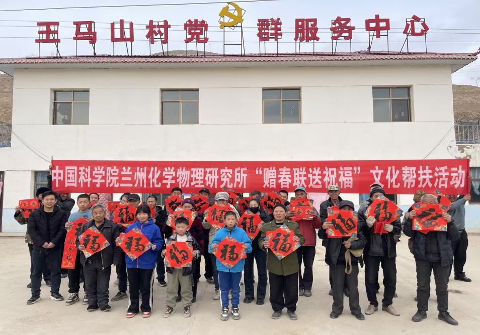為豐富農(nóng)村精神文化生活,在2025年新春佳節(jié)來臨之際,1月23日下午,中國科學(xué)院蘭州化學(xué)物理研究所在會(huì)寧縣漢家岔鎮(zhèn)王馬山村開展了“贈(zèng)春聯(lián) 送祝福”活動(dòng),為幫扶村老鄉(xiāng)們送去研究所的關(guān)心問候和美好祝福。