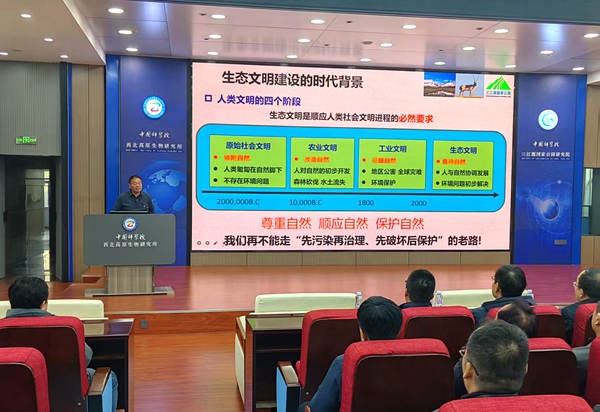 隨后,黨委委員、高原生態(tài)學(xué)研究中心主任徐世曉研究員向參加活動的黨員作了“致力高原生態(tài)學(xué)研究 助力生態(tài)文明發(fā)展”專題報告,報告從生態(tài)文明建設(shè)的時代背景,國家戰(zhàn)略需求、青藏高原生態(tài)安全屏障重要作用等三方面,詳細(xì)介紹了西北高原所針對高寒區(qū)生態(tài)系統(tǒng)脆弱性、敏感性,生態(tài)保護(hù)和可持續(xù)發(fā)展開展的一系列研究和取得的成果。通過大量案例和數(shù)據(jù),讓大家深入了解了生態(tài)修復(fù)、綠色產(chǎn)業(yè)發(fā)展的成功經(jīng)驗,深刻認(rèn)識到科學(xué)保護(hù)青藏高原生態(tài)系統(tǒng)、推動綠色發(fā)展的重要性。