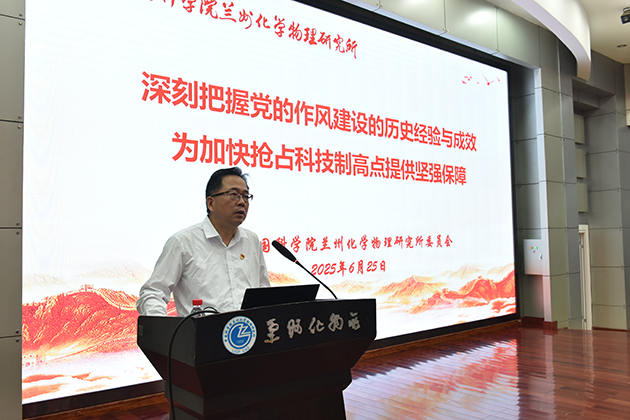 6月25日上午,中國科學院蘭州化學物理研究所舉行慶祝建黨104周年黨員大會暨深入貫徹中央八項規(guī)定精神學習教育主題黨課報告會。全所黨員領導干部、職工和研究生黨員及離退休黨員代表、民主黨派代表等參加會議。所長、黨委副書記周峰主持會議。