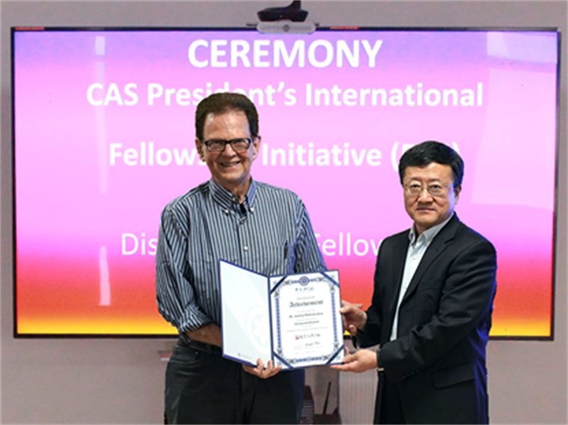 圖1:趙紅衛(wèi)為James P. Vary教授頒發(fā)中國(guó)科學(xué)院國(guó)際人才計(jì)劃杰出科學(xué)家獎(jiǎng)狀