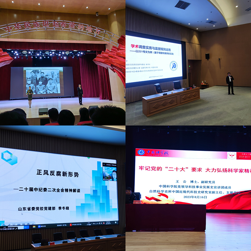 此次培訓結合工作實際,特邀了山東省委黨校季冬曉教授對二十屆中紀委二次全會精神進行解讀,讓參訓人員更加清晰地對全面從嚴治黨體系,特別是黨內監(jiān)督的具體內容有了更加深入的理解;中國科學院監(jiān)督與審計局科研誠信與倫理辦公室主任侯興宇作題為《學術調查實務與監(jiān)督規(guī)則運用》輔導報告,提升了在處理科研誠信案件中分析運用的能力;中國近現(xiàn)代科技史研究室副主任、中國科學院黨領導科技事業(yè)發(fā)展史宣講團隊成員、中國科學院自然科學史研究所副研究員王公作《牢記黨的二十大要求 大力弘揚科學家精神》專題講座,以梳理和講述中國科學史的發(fā)展進程為主線,將一代又一代無私奉獻,攻堅克難,以家國命運為己任的科學家事跡貫穿其中,逐步深入地闡述了科學家精神的內涵及其時代價值。