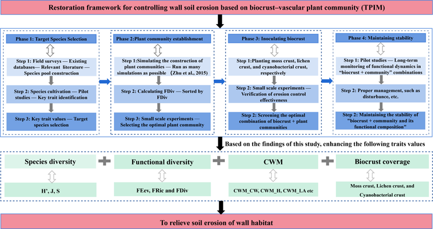 研究發(fā)現(xiàn),維管束植物物種豐富度、物種多樣性、功能豐富度、群落加權(quán)平均和苔蘚結(jié)皮蓋度由土長(zhǎng)城遺址頂部向下部顯著降低,且與土長(zhǎng)城兩側(cè)土體侵蝕程度呈負(fù)相關(guān)(圖1),表明土長(zhǎng)城本體較高的區(qū)域有利于維管束植物和生物結(jié)皮的定殖和生長(zhǎng)。同時(shí),維管束植物和生物結(jié)皮的協(xié)同作用能有效緩解遺址本體遭受風(fēng)雨侵蝕(圖2)?;诖?,研究人員提出了基于生物結(jié)皮和維管束植物群落構(gòu)建目標(biāo)物種選擇、植物群落構(gòu)建、生物結(jié)皮接種和維持群落穩(wěn)定等增強(qiáng)土長(zhǎng)城抗侵蝕的“修復(fù)框架”(圖3),為土長(zhǎng)城遺址本體侵蝕防治提供了新思路。