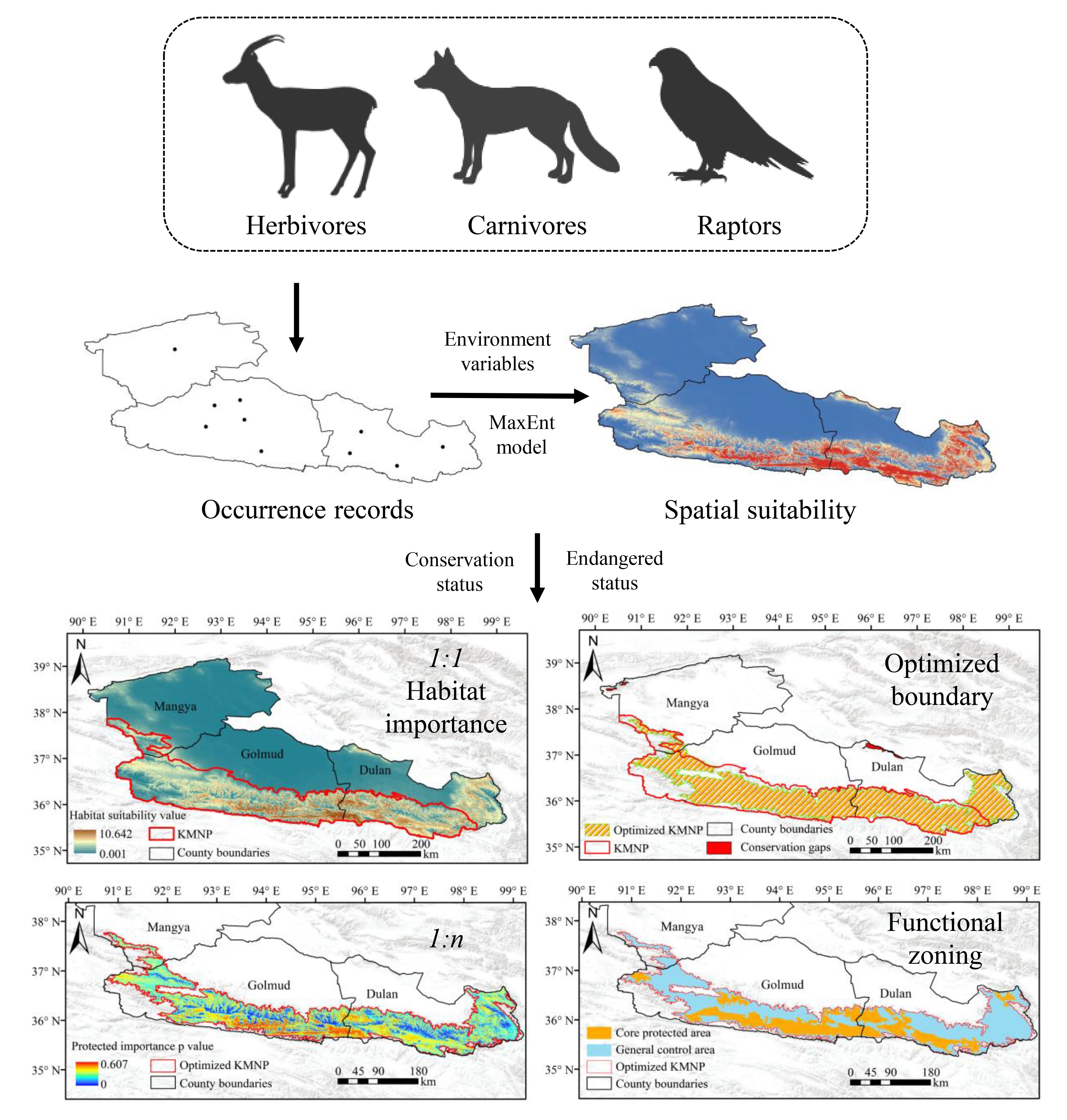 為探究昆侖山國(guó)家公園(青海片區(qū))邊界范圍及功能區(qū)域劃分,中國(guó)科學(xué)院西北高原生物研究所動(dòng)物生態(tài)與資源保護(hù)研究團(tuán)隊(duì)在2021年12月至翌年1月(冬季)和2022年7月(夏季)期間開展昆侖山國(guó)家公園(青海片區(qū))候選區(qū)的野生動(dòng)物本底調(diào)查,記錄了16個(gè)國(guó)家級(jí)保護(hù)動(dòng)物共計(jì)4523個(gè)位點(diǎn)(優(yōu)化后為3921個(gè)),采用生態(tài)位模型開展該區(qū)域重要物種適宜棲息地評(píng)估研究,并基于不同野生動(dòng)物的保護(hù)現(xiàn)狀及瀕?,F(xiàn)狀,開展昆侖山國(guó)家公園邊界范圍及其功能區(qū)域劃分及其保護(hù)空缺研究。研究表明,昆侖山地區(qū)重點(diǎn)物種適宜分布于海拔4100 m至4700 m、年平均溫度為-2℃至-4.5℃之間的半干旱區(qū),其植被類型為高寒草甸和高寒草原,土地利用類型為草地和未利用土地。不同野生動(dòng)物在昆侖山地區(qū)的適宜空間分布不盡相同,主要集中在昆侖山地區(qū)西南部、中部及東南部地區(qū)。優(yōu)化昆侖山國(guó)家公園青海片區(qū)的面積約為4.98×104 km2,比候選區(qū)域面積減少了16.3%,其中核心保護(hù)區(qū)和一般管控區(qū)面積分別為1.63×104 km2和3.32×104 km2。93.75%(15/16)的重點(diǎn)物種在昆侖國(guó)家公園核心保護(hù)區(qū)的適宜性依次高于優(yōu)化區(qū)域、候選區(qū)域及茫崖市-格爾木市-都蘭縣地區(qū),這表明昆侖山國(guó)家公園邊界范圍劃分及功能區(qū)域劃分具有較強(qiáng)的合理性。該研究成果不僅為昆侖山國(guó)家公園的保護(hù)和管理提供了重要科學(xué)依據(jù),有助于維護(hù)生態(tài)系統(tǒng)、保護(hù)生物多樣性和促進(jìn)重點(diǎn)物種的繁衍生存,而且為青藏高原國(guó)家公園群的建設(shè)和生態(tài)文明提供了指導(dǎo),具有潛在的應(yīng)用前景。