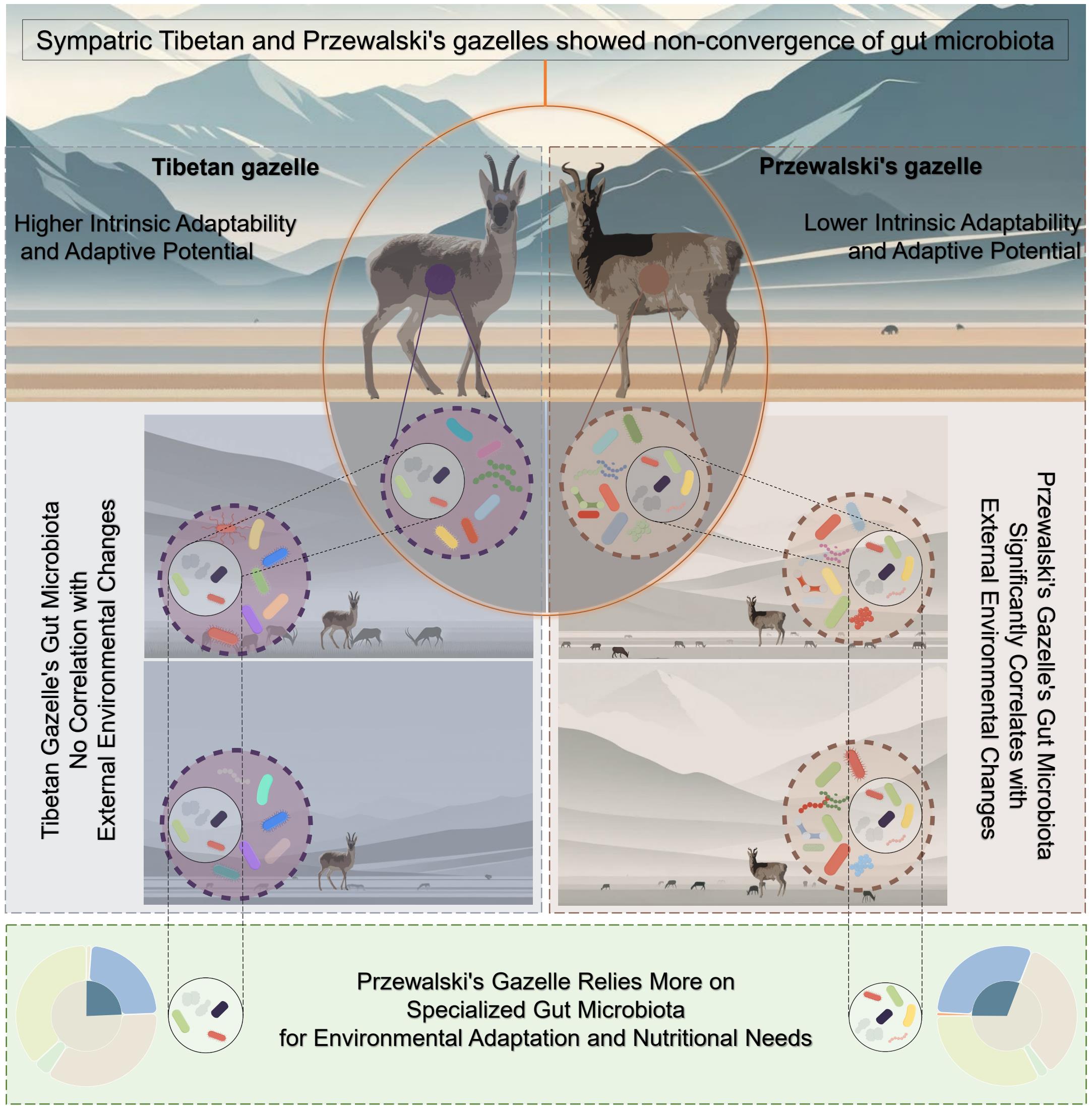 研究論文?Gut microbiota non-convergence and adaptations in sympatric Tibetan and Przewalski’s gazelles?發(fā)表在?Cell Press?旗下交叉學(xué)科期刊?iScience(中國科學(xué)院二區(qū))。西北高原所博士研究生宋鵬飛為第一作者,張同作研究員為通訊作者。該研究得到了國家自然科學(xué)基金區(qū)域創(chuàng)新發(fā)展聯(lián)合基金(U20A2012)等項(xiàng)目的支持。學(xué)科組依托中國科學(xué)院高原生物適應(yīng)與進(jìn)化重點(diǎn)實(shí)驗(yàn)室和青海省動物生態(tài)基因組學(xué)重點(diǎn)實(shí)驗(yàn)室。