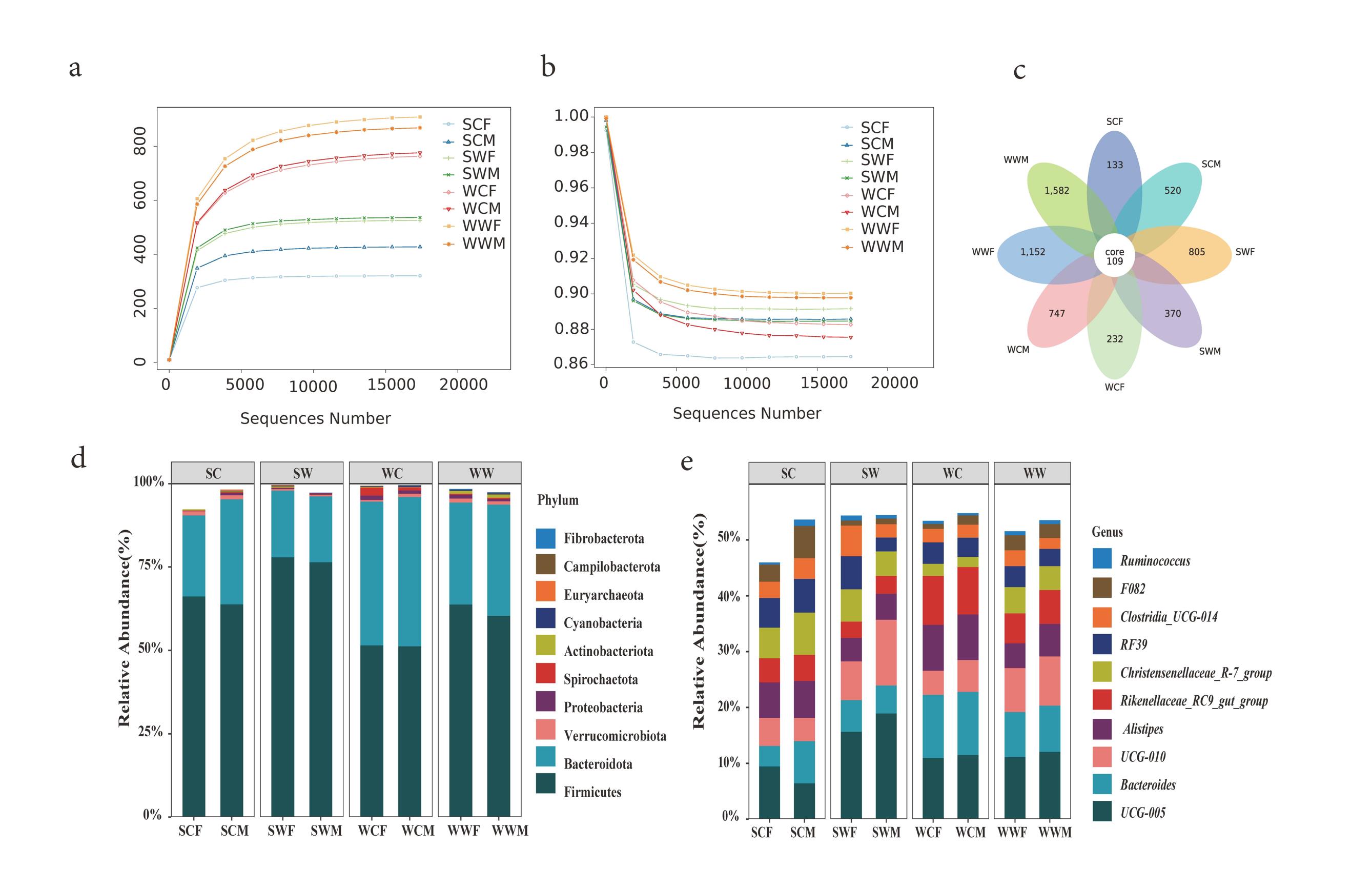 巖羊腸道菌群群落豐富度(a)和均勻度(b)稀釋曲線;不同組間ASV數(shù)量花瓣圖(c);門水平(d)和屬水平(e)巖羊腸道菌群相對(duì)豐度堆積直方圖