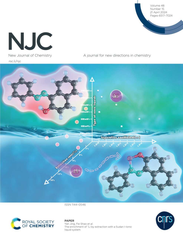 中國科學(xué)院青海鹽湖研究所同位素分離與化學(xué)品精制課題組針對蘇丹Ⅰ(1-苯基偶氮-2-萘酚)萃取富集7Li分離效應(yīng)低問題開展研究?;陔x子液體在鋰同位素分離體系中表現(xiàn)出優(yōu)異的協(xié)萃性能,將離子液體引入蘇丹Ⅰ體系中,構(gòu)建蘇丹離子液體(Ⅰ-[HMIm][BF4])萃取體系,極大提高了蘇丹Ⅰ對7Li的分離能力。蘇丹Ⅰ與Li+是1:1進(jìn)行絡(luò)合,過程中離子液體在跨界面遷移中主要起輔助作用,離子液體陰離子親水性越強(qiáng),其輔助萃取作用越強(qiáng),且計(jì)算表明離子液體的陰離子極有可能參與了蘇丹Ⅰ與鋰離子的配位。此研究成果在New Journal of Chemistry期刊發(fā)表封面學(xué)術(shù)論文一篇,SCI收錄。