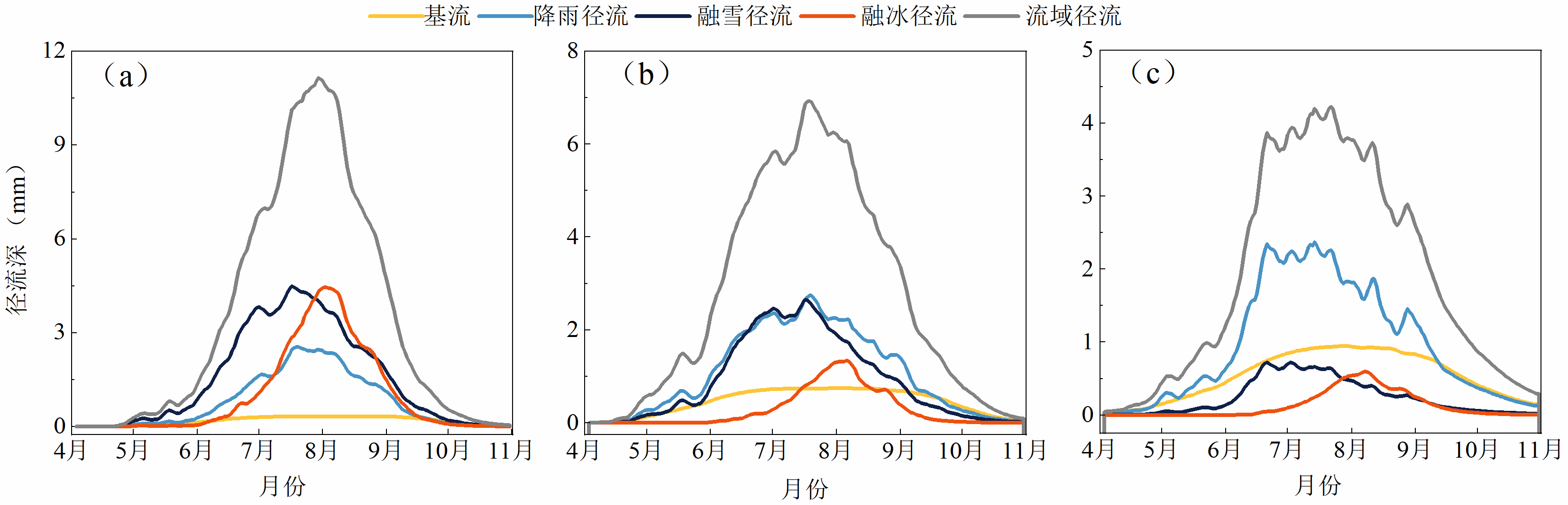 圖1 烏源1號(hào)冰川(a)、總控(b)和后峽(c)子流域4?10月基流,降雨徑流,融雪徑流和融冰徑流