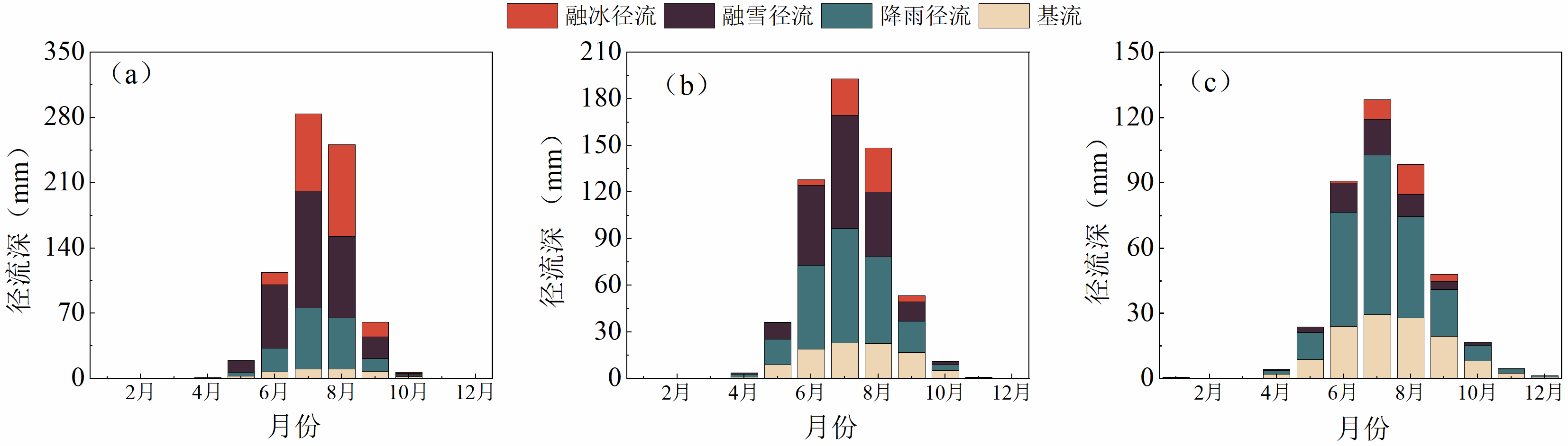 圖2 烏源1號(hào)冰川(a)、總控(b)和后峽(c)子流域徑流組分的月變化趨勢(shì)