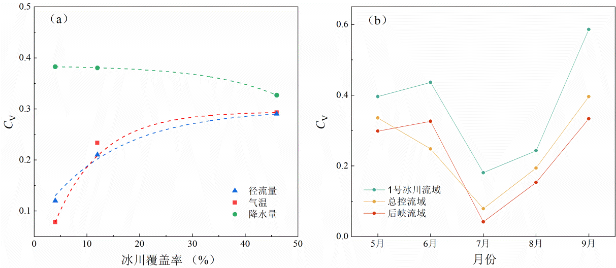 (3)三個(gè)子流域融冰徑流和冰川徑流的貢獻(xiàn)率與冰川覆蓋率呈線性關(guān)系,與前人在阿爾卑斯山38個(gè)冰川覆蓋流域研究得到的對(duì)數(shù)關(guān)系有所不同,主要是烏河流域冰川在夏季強(qiáng)烈消融所致(圖3)。三個(gè)子流域的徑流變差系數(shù)(CV)分別為0.29、0.21和0.12,隨著冰川覆蓋率的降低而減小,這主要與流域徑流組成、下墊面特征等因素有關(guān)(圖4)。