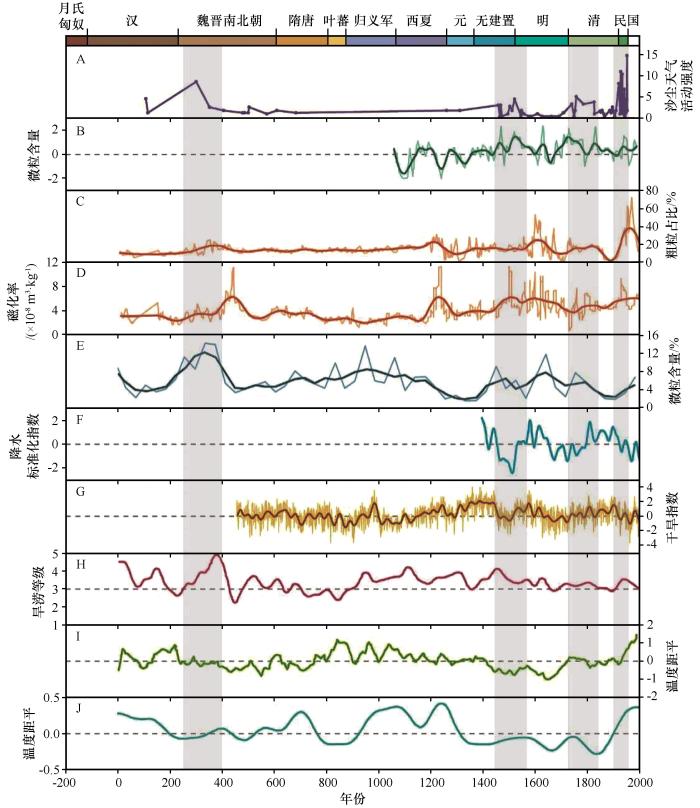 圖2? 敦煌歷史時期沙塵天氣活動強度序列(A),敦德冰芯微粒含量(B),蘇干湖沉積物粗粒含量(C),蘇干湖沉積物磁化率(D),巴里坤湖沉積物組分含量(E),河西走廊近600年降水序列(F),河西走廊帕爾默干旱度指數(shù)(scPDSI)序列(G),黑河流域近2 000年旱澇序列(H),Yang等重建的中國2 000年溫度序列(I),Ge等重建的中國2 000年溫度序列(J)