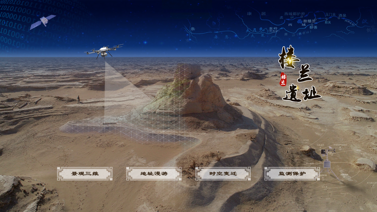 系統(tǒng)平臺(tái)通過“景觀三維、遺址漫游、時(shí)空變遷、監(jiān)測(cè)保護(hù)”四個(gè)功能模塊,實(shí)現(xiàn)了衛(wèi)星宏觀遙感、無人機(jī)精細(xì)測(cè)繪、地面實(shí)時(shí)監(jiān)測(cè)等綜合技術(shù)在樓蘭遺址的協(xié)同應(yīng)用。能夠通過精細(xì)二三維實(shí)景地圖模型客觀真實(shí)、身臨其境地展示遠(yuǎn)在千里之外的神秘古城;通過歷史地圖和衛(wèi)星遙感數(shù)據(jù)的空間一體化,提供了一套研究樓蘭古跡時(shí)空演變的空間數(shù)據(jù)庫(kù);利用衛(wèi)星、無人機(jī)和地面?zhèn)鞲衅骷夹g(shù),實(shí)現(xiàn)了“天空地”一體化的樓蘭遺址生態(tài)環(huán)境因子系統(tǒng)監(jiān)測(cè)與分析。