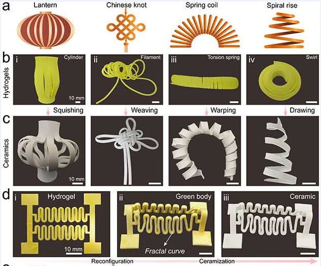 近日,中國科學(xué)院蘭州化學(xué)物理研究所潤(rùn)滑材料重點(diǎn)實(shí)驗(yàn)室3D打印摩擦器件組在采用3D打印柔性水凝膠前驅(qū)體制備復(fù)雜結(jié)構(gòu)陶瓷方面取得重要進(jìn)展。該團(tuán)隊(duì)發(fā)展了利用3D 打印水凝膠柔性骨架輔助高幾何復(fù)雜性、高打印精度和形狀保真度陶瓷成形的新方案,解決了傳統(tǒng)陶瓷制造中因脆性和剛性導(dǎo)致的形狀復(fù)雜性和尺寸收縮問題,展示了在立體電路、生物醫(yī)學(xué)和功能催化等領(lǐng)域廣泛的應(yīng)用前景。