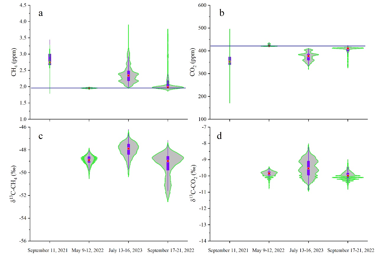 圖2.不同時(shí)期冰洞內(nèi)甲烷、二氧化碳濃度和其同位素特征