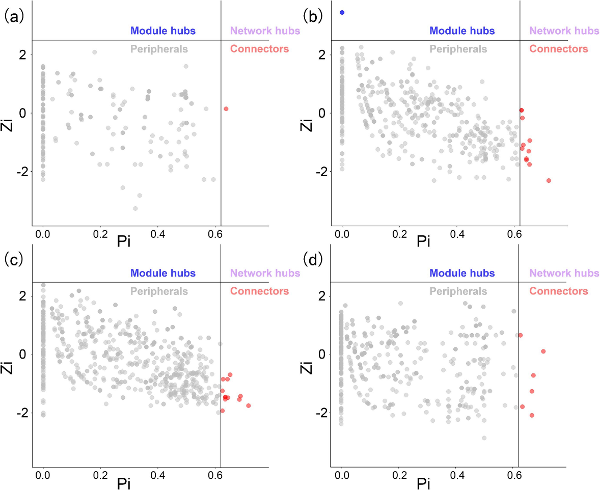 圖 1. 冰川四種生境中細(xì)菌、真菌和古菌群落的跨營養(yǎng)級網(wǎng)絡(luò)關(guān)系