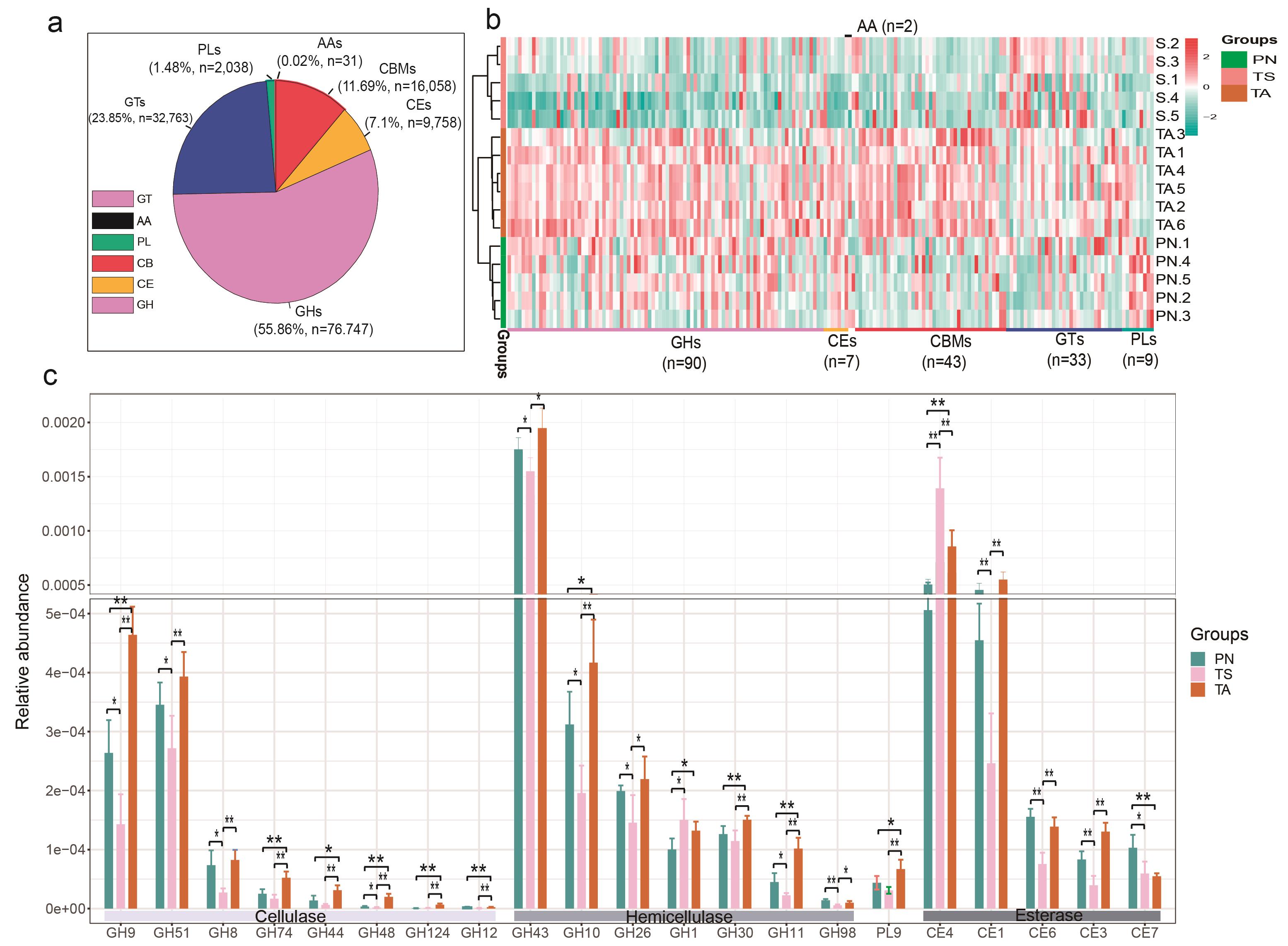 不同小反芻動(dòng)物CAZYme酶基因分布特征。(a) unigenens 整體分布狀況;(b)糖苷水解酶(GHs)、糖基轉(zhuǎn)移酶(GTs)、多糖裂解酶(PLs)、碳水化合物酯酶(CEs)及碳水化合物結(jié)合模塊(CBMs)富集分析;(c)不同小反芻動(dòng)物腸道菌群有關(guān)纖維素酶、半纖維素酶及酯酶基因顯著性分析