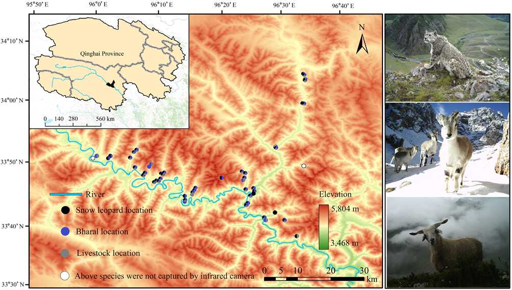 中國(guó)科學(xué)院西北高原生物研究所動(dòng)物生態(tài)與資源保護(hù)研究團(tuán)隊(duì)以人獸沖突較為嚴(yán)重的曲麻萊縣巴干鄉(xiāng)為研究地區(qū),利用調(diào)查問(wèn)卷評(píng)估了當(dāng)?shù)啬撩駥?duì)雪豹襲擊家畜事件的態(tài)度,并結(jié)合紅外相機(jī)陷阱技術(shù)獲得了雪豹和其主要獵物巖羊(Pseudois nayaur)以及散養(yǎng)家畜的影像資料,進(jìn)而探討了三種(類)動(dòng)物的時(shí)空重疊。研究結(jié)果表明:?。?)雪豹主要在夜間捕食家畜,牧民因雪豹襲擊家畜事件的發(fā)生而對(duì)雪豹保護(hù)持消極態(tài)度;(2)巖羊和家畜的空間利用重疊度最高(OI?。健?.78),其次是雪豹和巖羊(OI?。健?.75)以及雪豹和家畜(OI = 0.75);(3)雪豹屬于典型的夜行性動(dòng)物,而巖羊和家畜以晝間活動(dòng)為主。巖羊和家畜的日活動(dòng)節(jié)律模式高度一致,時(shí)間重疊指數(shù)最高(D = 0.95),而雪豹和巖羊、雪豹和家畜的日活動(dòng)節(jié)律重疊指數(shù)較低(D?。健?.51),且重疊時(shí)段主要集中于夜間。綜上所述,由于雪豹、巖羊和散養(yǎng)家畜之間存在較高的空間重疊,可能增加了家畜被雪豹捕食的機(jī)會(huì),同時(shí),家畜和巖羊活動(dòng)節(jié)律的高度重疊進(jìn)一步加劇了此類事件的發(fā)生幾率。基于研究結(jié)果,我們提出了針對(duì)性的保護(hù)和管理措施,例如規(guī)范放牧區(qū)域以減小家畜與雪豹的相遇幾率,加強(qiáng)對(duì)散養(yǎng)家畜的夜間管理以減少雪豹夜間肇事等。