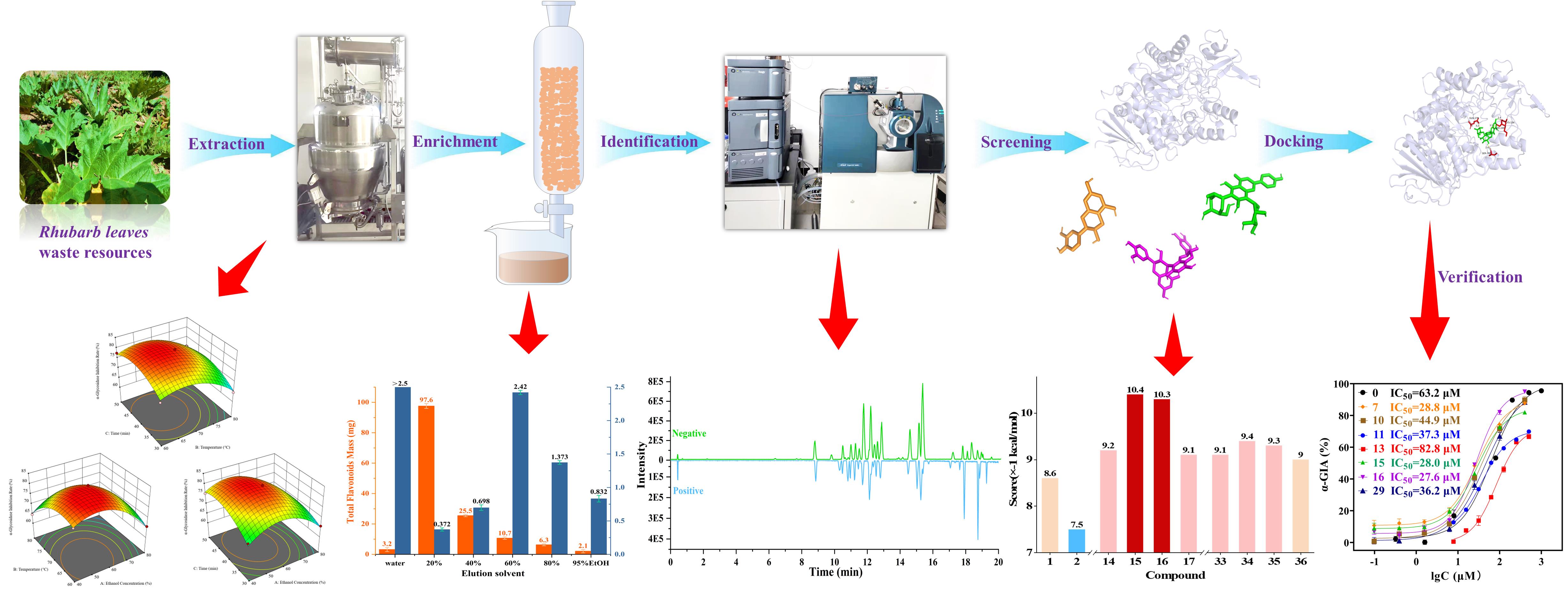 中國(guó)科學(xué)院西北高原生物研究所高原藏藥資源質(zhì)控與藥理毒理評(píng)價(jià)研究團(tuán)隊(duì)以α-葡萄糖苷酶抑制活性作為關(guān)鍵評(píng)價(jià)指標(biāo),建立了基于大孔吸附樹脂富集、UPLC-QTOF-MS/MS分析表征、分子對(duì)接、體外驗(yàn)證的唐古特大黃葉中α-葡萄糖苷酶抑制劑的系統(tǒng)篩選策略,篩選得到myricitrin、rumarin等6個(gè)α-葡萄糖苷酶抑制劑?;诜€(wěn)態(tài)、同步、三維熒光光譜和遠(yuǎn)紫外圓二色譜等多光譜技術(shù)的對(duì)接機(jī)制研究表明,6個(gè)抑制劑均能與α-葡萄糖苷酶發(fā)生結(jié)合并改變靶蛋白的酪氨酸和色氨酸殘基微環(huán)境,通過(guò)降低靶蛋白α-螺旋或β-轉(zhuǎn)角等二級(jí)結(jié)構(gòu)的含量從而導(dǎo)致蛋白酶失活,該研究為唐古特大黃廢棄資源的利用提供了新的見解。