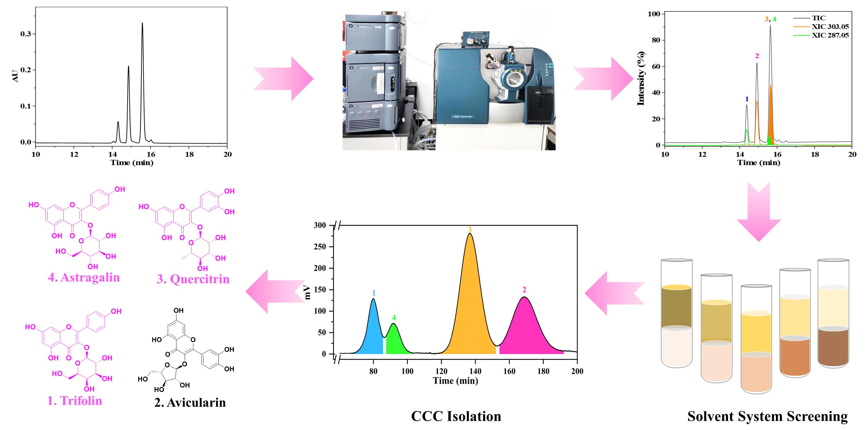 另外,由于天然產(chǎn)物組成成分和結(jié)構(gòu)復(fù)雜多樣,常常會(huì)出現(xiàn)色譜共洗脫現(xiàn)象,難以被發(fā)現(xiàn)、分析和分離。針對(duì)這一挑戰(zhàn),研究團(tuán)隊(duì)提出一種基于UPLC-QTOF-MS/MS和CCC的HPLC共洗脫異構(gòu)體的差異識(shí)別和靶向分離策略。通過(guò)UPLC-QTOF-MS/MS實(shí)現(xiàn)了對(duì)共洗脫異構(gòu)體的差異特征精確識(shí)別和準(zhǔn)確定量,解決了共洗脫異構(gòu)體無(wú)法進(jìn)行CCC溶劑系統(tǒng)篩選的關(guān)鍵技術(shù)問(wèn)題?;诖瞬呗?,成功從唐古特大黃葉中分離得到astragalin等四種高純度的黃酮類化合物,其中三個(gè)互為異構(gòu)體。該研究為天然產(chǎn)物分離過(guò)程中共洗脫異構(gòu)體的分析和分離提供了新的思路。