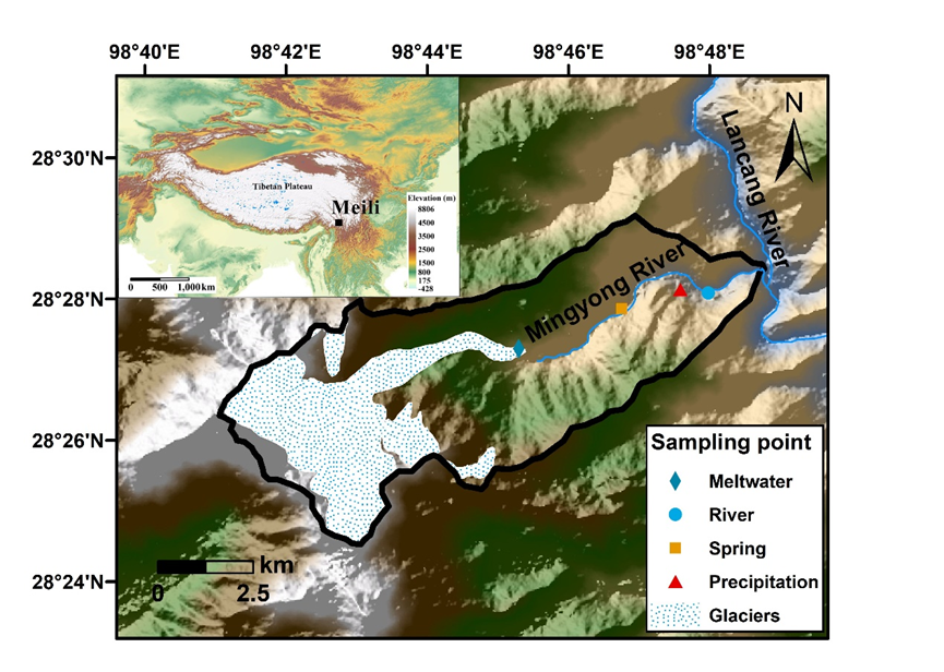 中國科學(xué)院西北生態(tài)環(huán)境資源研究院冰凍圈科學(xué)與凍土工程重點實驗室科研團隊,聯(lián)合中國科學(xué)院地質(zhì)與地球物理研究所、浙江師范大學(xué)、云南大學(xué)等多家單位,依托云南麗江玉龍雪山冰凍圈與可持續(xù)發(fā)展國家野外科學(xué)觀測研究站“一站四區(qū)”觀測網(wǎng),在梅里雪山明永河流域開展了為期一年的日尺度觀測,剖析冰川徑流中總汞濃度的變化規(guī)律及控制因素,量化汞的輸入通量,并評估明永河流域以及整個青藏高原冰川徑流中總汞的輸出通量。
