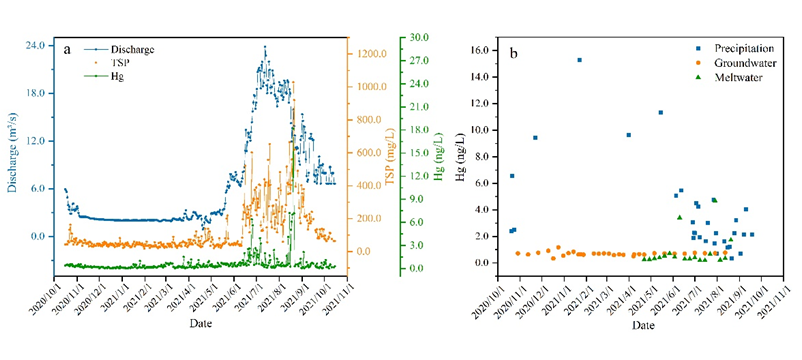 研究發(fā)現(xiàn),季風(fēng)期冰川徑流中總汞濃度高于非季風(fēng)期。季風(fēng)期冰川徑流中的總汞濃度與總懸浮顆粒物(TSP)、溶解有機碳(DOC)和溶解無機碳(DIC)呈現(xiàn)顯著正相關(guān)(p < 0.001),非季風(fēng)期徑流中的總汞與TSP、流量、溫度和降水量顯著正相關(guān)(p?。肌?.001),與DIC呈現(xiàn)負相關(guān)關(guān)系(p?。肌?.01),表明冰川徑流中總汞濃度受到氣象、水文過程和其它環(huán)境因子的共同影響。