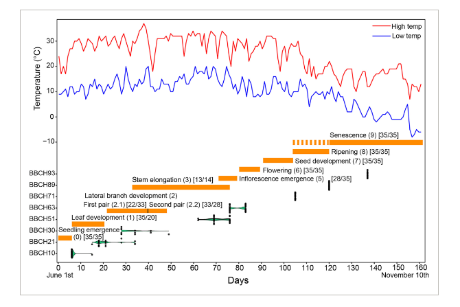 生長發(fā)育階段及其標(biāo)志性發(fā)育事件的確認(rèn)是開展遺傳學(xué)研究、建立表型變異和遺傳控制基因之間因果關(guān)系的重要前提條件?;趪HBBCH編碼系統(tǒng),課題組定義了9個沙蓬生長發(fā)育階段,涵蓋了整個生活史,明確了標(biāo)志性發(fā)育事件,建立了沙蓬BBCH編碼系統(tǒng)。通過大田實驗,驗證了該編碼系統(tǒng)的可行性,量化了各個主要階段及其次級細(xì)分階段的時間持續(xù)范圍,為開展沙蓬種質(zhì)資源評價、分子遺傳學(xué)研究和遺傳馴化建立了生長發(fā)育時期轉(zhuǎn)換的表型參考標(biāo)準(zhǔn)。
