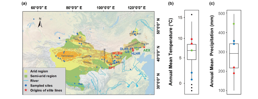 圖4??沙蓬采樣點的地理分布和當(dāng)?shù)貧夂驐l件以及選育株系的起源地