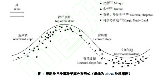 圖5??流動沙丘沙蓬種子庫分布形式(虛線為 20 cm 沙埋深度)?