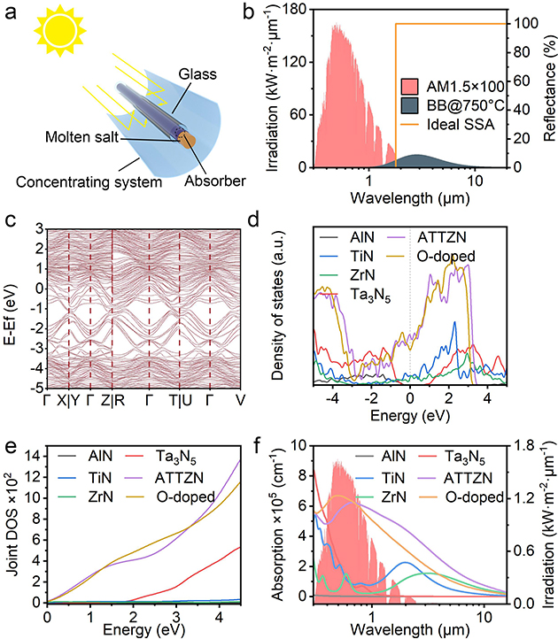 基于高熵氮化物光吸收材料的前期研究,為滿足聚光太陽能系統(tǒng)高溫(750°C)工況下的應(yīng)用需求,研究人員精心選擇了構(gòu)成元素,并系統(tǒng)性地研究了高熵設(shè)計對材料電子結(jié)構(gòu)的影響(圖1)。研究結(jié)果顯示,高熵氮化物的復(fù)雜能帶結(jié)構(gòu)顯著提高了費米能級附近的態(tài)密度。同時,平坦的能帶結(jié)構(gòu)拓寬了材料的太陽能吸收范圍,并增強(qiáng)了帶間躍遷效應(yīng),提升了材料的太陽能吸收性能。