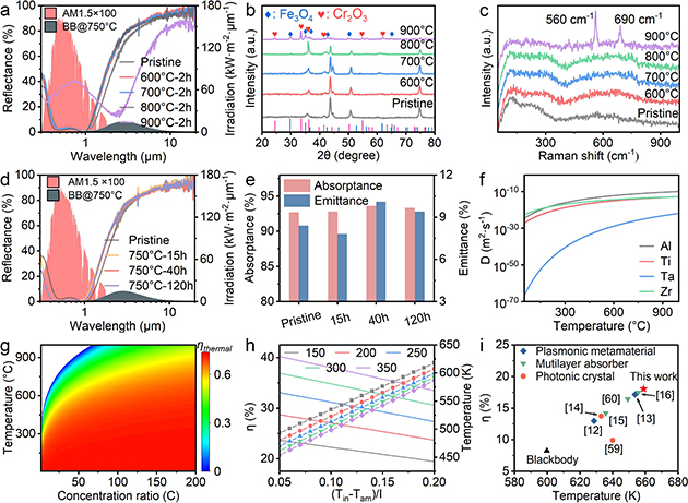 該團(tuán)隊通過反應(yīng)磁控濺射法制備出由高熵氮化物吸收層和氮化硅減反射層組成的雙層光譜選擇性吸收涂層。在太陽光譜波段(0.3-2.5 μm)表現(xiàn)出92.7%的吸收率,紅外波段的熱發(fā)射率僅為8.4%。在1 kW·m-2模擬太陽光輻照條件下,涂層表面溫度在10分鐘內(nèi)可達(dá)到83.3°C;在戶外應(yīng)用中,其平衡溫度與非選擇性涂層的差異高達(dá)~21°C,展現(xiàn)出優(yōu)異的光熱轉(zhuǎn)換效率和光譜選擇性。此外,得益于高熵效應(yīng)和緩慢擴(kuò)散效應(yīng)帶來的結(jié)構(gòu)穩(wěn)定性,該涂層在750°C退火后仍保持了出色的光學(xué)性能(圖2)。該涂層憑借其出色的光熱轉(zhuǎn)換能力、優(yōu)異的熱穩(wěn)定性和簡單易于規(guī)模化生產(chǎn)的雙層結(jié)構(gòu),在提升槽式聚光發(fā)電系統(tǒng)效率方面具有重要意義,并為能源新質(zhì)生產(chǎn)力發(fā)展提供了技術(shù)支撐。相關(guān)研究成果發(fā)表在Advanced Functional Materials?。?/span>2024,2411316)上。趙鵬博士為論文的第一作者,高祥虎研究員和何成玉博士后為共同通訊作者。