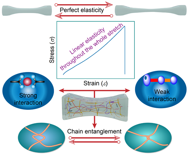 近二十年,聚合物凝膠,尤其是水凝膠,其力學(xué)強(qiáng)度、韌性、疲勞和黏附等性質(zhì)的調(diào)控和提升已取得巨大進(jìn)步,體現(xiàn)在先進(jìn)的力學(xué)機(jī)制和構(gòu)造方法。然而,在力學(xué)強(qiáng)度和完美彈性之間尋求權(quán)衡仍是一個(gè)挑戰(zhàn)。