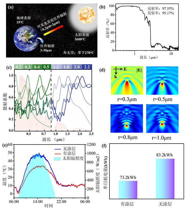 圖2.?。?/span>a) 構(gòu)建地球-太陽-外太空能源利用體系;(b) 輻射制冷涂層反射光譜;(c) 不同粒徑光學(xué)材料對(duì)0.5μm入射光的散射系數(shù)和(d) 電場分布;(e) 2024年8月18日06:00-19日06:00,太陽輻照度及儲(chǔ)能集裝箱表面溫度變化和(f) 空調(diào)制冷耗電量變化