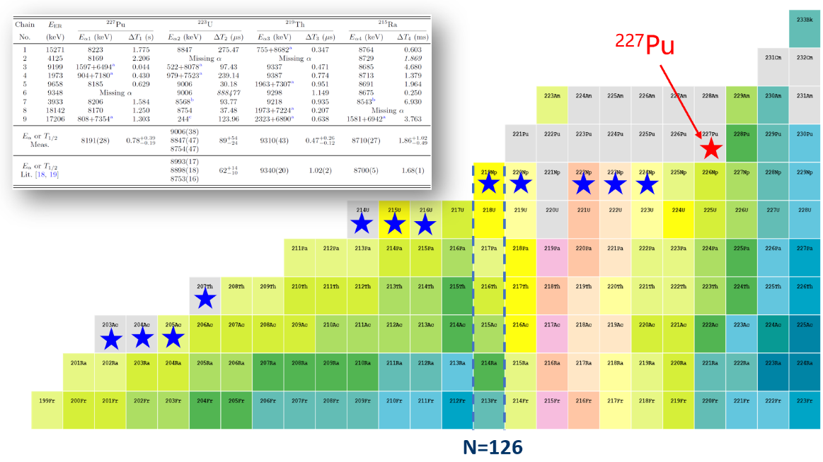 圖:實(shí)驗(yàn)觀測到的9個(gè)新核素钚-227的α衰變事件以及钚-227在核素圖上的位置(紅色五星)。藍(lán)色五星標(biāo)記的是近代物理所團(tuán)隊(duì)此前合成的部分新核素。(圖/楊華彬)