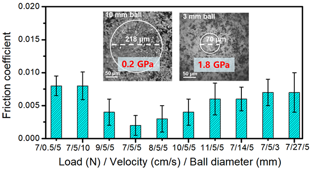 同時,研究人員發(fā)現(xiàn)碳薄膜表面石墨烯片段之間彼此排列角度各異、呈現(xiàn)出無序性。這種結(jié)構(gòu)無序性誘導(dǎo)與石墨表面之間非公度性,加之薄膜整體成型制備避免了石墨烯邊緣暴露,有效減弱了阻礙結(jié)構(gòu)超潤滑放大的邊緣效應(yīng),從而通過石墨島尺度逐級增加,實現(xiàn)了濕度不敏感超潤滑跨尺度放大。本研究也存在不足,近似無磨損的設(shè)計,限制了體系承載性等性能的提高。