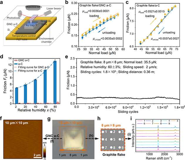 近日,研究人員針對固體表面濕度敏感、超潤滑跨尺度易失效等基礎(chǔ)科學問題開展系統(tǒng)研究?;谖墨I調(diào)研,發(fā)現(xiàn)固體表面濕度敏感源于磨損后暴露的新表面,導(dǎo)致與水分子作用強烈的化學斷鍵形成。研究人員提出了運動界面“(近似)無磨損無化學反應(yīng)”思路,通過磁控濺射物理氣相沉積技術(shù),制備石墨烯覆蓋表面的納米結(jié)構(gòu)碳薄膜,構(gòu)建碳薄膜/微觀石墨島體系,實現(xiàn)了穩(wěn)健、濕度不敏感超潤滑(即相對濕度2-80%下均實現(xiàn)超滑)。鑒于界面近似無磨損特性,該體系表現(xiàn)出結(jié)構(gòu)性超潤滑性質(zhì)。