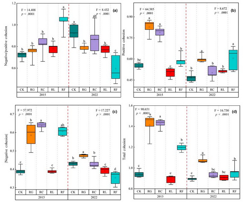 不同時(shí)間段下植物功能群去除后群落中負(fù)內(nèi)聚力與正內(nèi)聚力情況