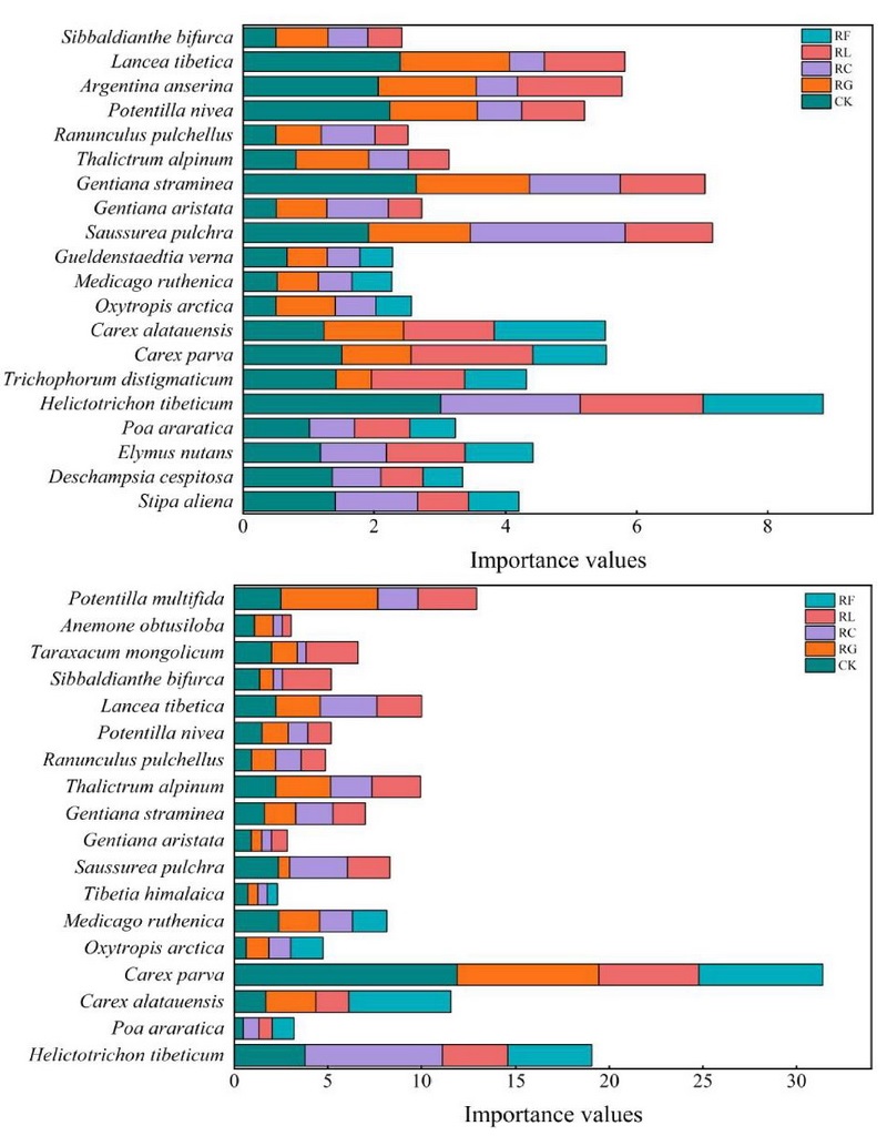 研究結(jié)果以?Effects of short-and long-term plant functional group loss on alpine meadow community structure and soil nutrients?和?Effects of short- and longterm plant functional group removal on alpine meadow community niche?為題分別發(fā)表在?Ecology and evolution(中國科學(xué)院二區(qū))和?Frontiers in Plant Science(中國科學(xué)院二區(qū))。西北高原所博士研究生魏晶晶為第1作者,周華坤研究員為通訊作者。該研究得到青藏高原地球系統(tǒng)、資源與環(huán)境國家重點(diǎn)實(shí)驗(yàn)室開放課題(TPESER202209)、2020年森林草原生態(tài)保護(hù)與恢復(fù)第二批資金--青海祁連山國家公園祁連山國家公園青海區(qū)生物多樣性保護(hù)項(xiàng)目(QHTX-2021-009)的共同資助。
