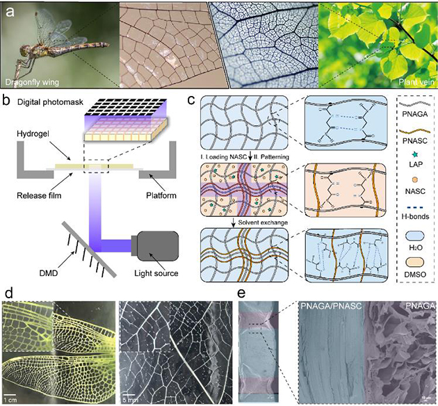 近日,中國科學(xué)院蘭州化學(xué)物理研究所潤滑材料重點(diǎn)實(shí)驗(yàn)室受自然界中廣泛存在的圖案化異質(zhì)結(jié)構(gòu)(如昆蟲翅膀和植物葉脈等)啟發(fā),發(fā)展了一種圖案化水凝膠(CSN水凝膠)方案實(shí)現(xiàn)了其多屬性、寬范圍的力學(xué)性能調(diào)控。如圖1所示,研究人員以光固化聚(N-丙烯酰甘氨酰胺)(PNAGA)水凝膠作為軟基質(zhì),通過先浸泡N-丙烯?;被澹?/span>NASC)前驅(qū)體溶液再以選區(qū)曝光構(gòu)建圖案化硬骨架(PNAGA@PNASC),然后經(jīng)后續(xù)水平衡過程中的相轉(zhuǎn)化誘導(dǎo)氫鍵重構(gòu)實(shí)現(xiàn)軟基質(zhì)和硬骨架的無縫互鎖,發(fā)展了具有局部互穿網(wǎng)絡(luò)的圖案化硬骨架強(qiáng)化水凝膠。