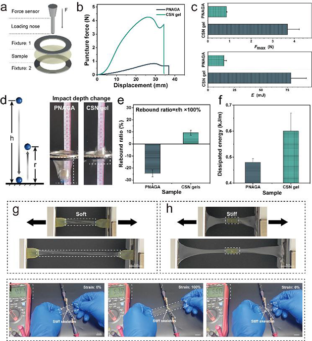 該方法制備的CSN水凝膠能夠在軟基質(zhì)凝膠基礎(chǔ)上,通過圖案化設(shè)計(jì)(包括圖案形狀、圖案參數(shù)、圖案化比例等)實(shí)現(xiàn)了其機(jī)械性能的增強(qiáng)和調(diào)控。研究人員通過對預(yù)制缺陷下的裂紋擴(kuò)展行為實(shí)驗(yàn)、循環(huán)拉伸實(shí)驗(yàn)、穿刺實(shí)驗(yàn)和落球?qū)嶒?yàn)對所制備的圖案化CSN水凝膠的力學(xué)性能進(jìn)行了系統(tǒng)研究,結(jié)果表明,其韌性可在0.15-18 kJ m-2(120倍)、模量在0.32-5.92 MPa(19倍)內(nèi)進(jìn)行調(diào)控(圖2),并展現(xiàn)出優(yōu)異的預(yù)制缺陷擴(kuò)展和形變不敏感以及抗沖擊等特性(圖3),為適應(yīng)不同應(yīng)用需求及其應(yīng)用過程中的自適應(yīng)性提供了有效的解決方案。