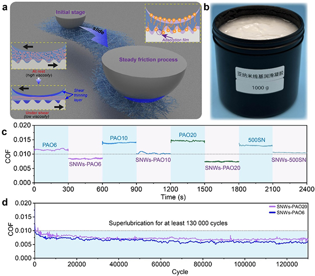 近期,中國(guó)科學(xué)院蘭州化學(xué)物理研究所潤(rùn)滑材料重點(diǎn)實(shí)驗(yàn)室王道愛研究員團(tuán)隊(duì)基于剪切稀化效應(yīng)的新型亞納米線基油脂基潤(rùn)滑劑(圖1),實(shí)現(xiàn)了在宏觀尺度下Si3N4與PTFE不同摩擦條件下的超潤(rùn)滑,在12小時(shí)內(nèi)無需補(bǔ)充潤(rùn)滑劑,摩擦系數(shù)穩(wěn)定保持在 0.007,展現(xiàn)出短磨合時(shí)間和長(zhǎng)期穩(wěn)定的潤(rùn)滑性能,具備廣闊的工業(yè)應(yīng)用前景,為超潤(rùn)滑領(lǐng)域帶來了新進(jìn)展。相關(guān)研究成果發(fā)表在Adv. Mater.(2024,2412257)上。