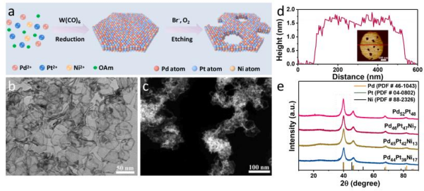 甲醇、乙醇等儲(chǔ)能小分子作為燃料的直接醇類燃料電池,具有能量密度高、工作溫度低、環(huán)境友好、燃料儲(chǔ)存和填充方便等優(yōu)點(diǎn)。電催化劑作為電催化反應(yīng)的核心,對(duì)提高燃料電池的效率起著重要作用。然而,目前開發(fā)的催化劑大多動(dòng)力學(xué)遲緩,并涉及多電子轉(zhuǎn)移過程的陽極醇氧化反應(yīng)。以Pt和Pd為代表的鉑族金屬表現(xiàn)出良好的催化效果,但在提高其固有活性和穩(wěn)定性的同時(shí)還需要進(jìn)一步降低成本。多孔納米結(jié)構(gòu)可進(jìn)一步增加比表面積和孔體積,從而最大限度地提高反應(yīng)物分子的有效傳質(zhì)能力和納米級(jí)電催化劑內(nèi)的電子遷移率。因此,調(diào)控超薄鉑基或鈀基合金的孔隙,有望成為最大化本征催化活性和穩(wěn)定性的新途徑。