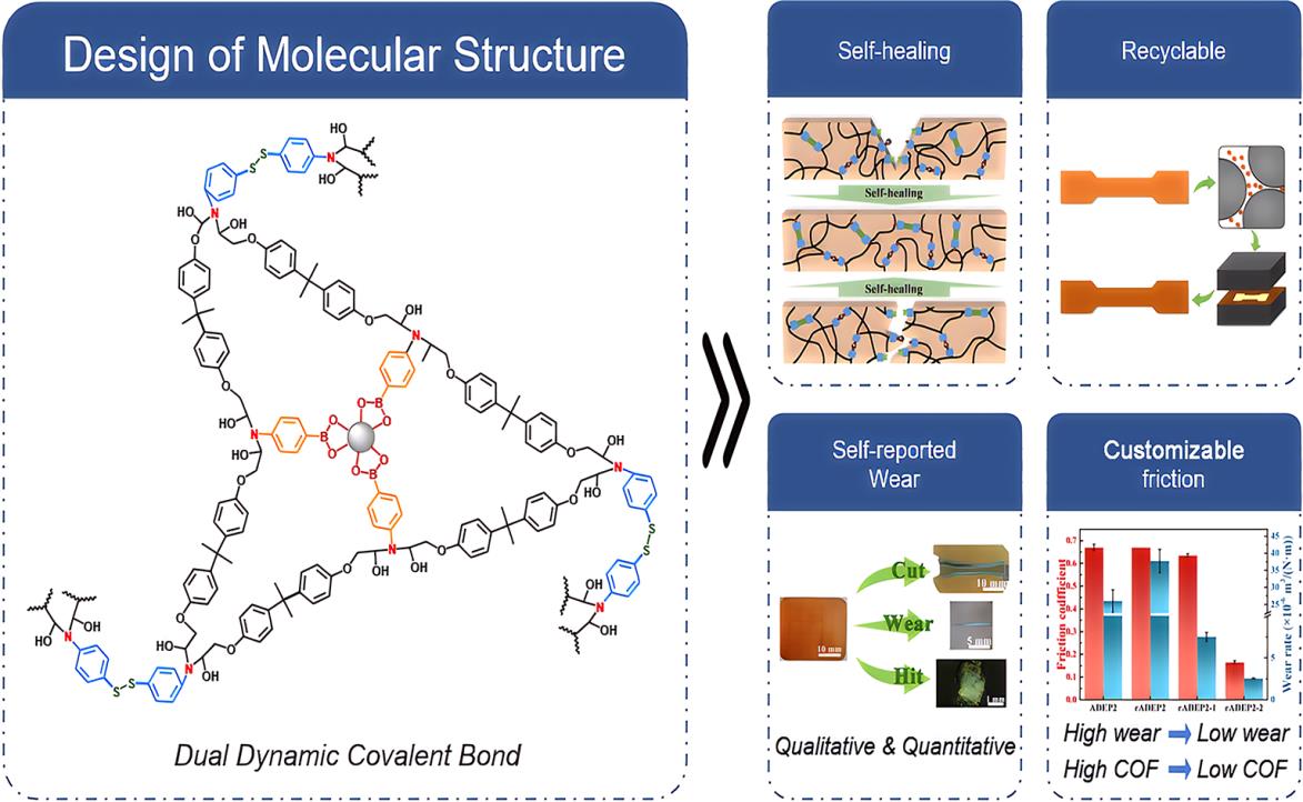 近日,研究人員通過動態(tài)可逆的分子結(jié)構(gòu)設(shè)計(jì),實(shí)現(xiàn)了一種具有自愈合、可回收、自報(bào)告磨損和可定制摩擦的多功能熱固性環(huán)氧樹脂?;趧討B(tài)共價(jià)鍵的可逆交換,環(huán)氧玻璃體可通過熱壓實(shí)現(xiàn)回收和損傷修復(fù),而無需額外的粘合劑或催化劑。此外,利用動態(tài)共價(jià)鍵的可逆性,將具有特定摩擦學(xué)特性的納米填料(氧化石墨烯和聚四氟乙烯)納入回收過程,以實(shí)現(xiàn)可定制的摩擦系數(shù)和耐磨損性能。不僅如此,研究人員利用二硫鍵的動態(tài)性質(zhì),實(shí)現(xiàn)了基于硫自由基的磨損自報(bào)告特性,還研究了磨損時(shí)間與磨損狀態(tài)之間的關(guān)系。
