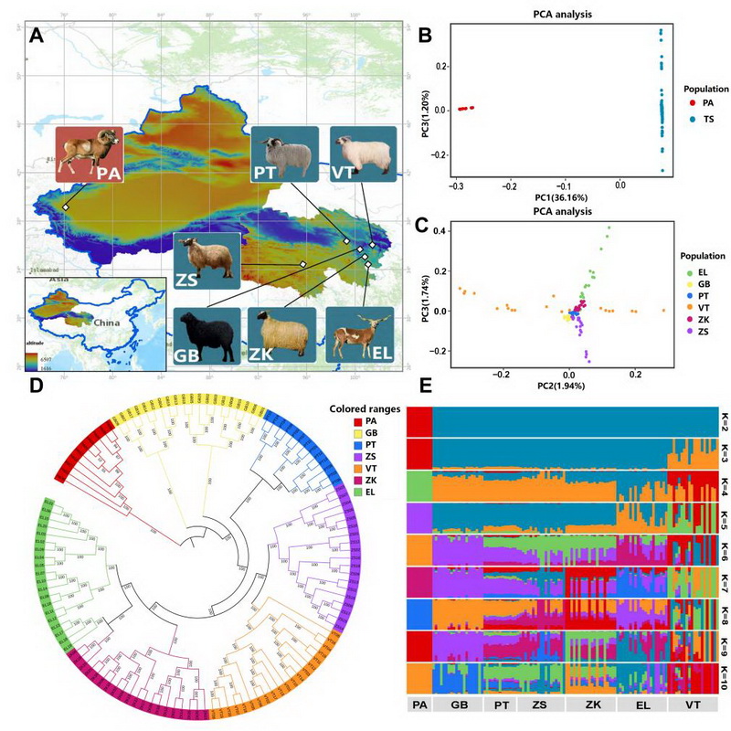 中國科學院西北高原生物研究所動物生態(tài)與資源保護研究團隊對青海省6個藏羊品種進行全基因組重測序。以盤羊為野生外類群,采用主成分分析、系統(tǒng)發(fā)育樹、遺傳結構、基因流、連鎖不平衡、祖先血緣分析等方法,首次系統(tǒng)性地揭示了青海省藏羊的遺傳結構與遺傳多樣性。研究結果表明,6個藏羊品種在系統(tǒng)發(fā)育樹中能明顯區(qū)分,盤羊和青海藏羊在同時期發(fā)生分化,各品種間存在廣泛的基因交流現(xiàn)象。基于ADMIXTURE分析,當祖先群體數(shù)K=2時,盤羊和藏羊追溯到不同的祖先譜系;當K=4時,可以推斷出青海藏羊有三個主要祖先血緣。