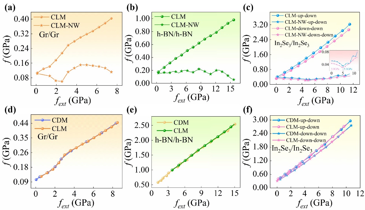 近日,中國科學院蘭州化學物理研究所潤滑材料全國重點實驗室計算摩擦學課題組與蘭州交通大學材料科學與工程學院等單位合作,使用自主搭建的固體界面摩擦性能第一性原理高通量計算平臺LICP-FPHTC-Platform ( 摩擦學學報42(2022)493;軟件著作權(quán)2021SR1172689),考慮目前主流的三種靜態(tài)摩擦性能計算模型——等距模型(CDM)、等載模型(CLM)、無負載做功的等載模型(CLM-NW),針對已報道了負摩擦系數(shù)的二維材料界面體系——Gr/Gr、h-BN/h-BN、In2Se3/In2Se3,研究了摩擦性能的計算結(jié)果對計算模型的依賴。結(jié)果表明,只有CLM-NW的計算模型出現(xiàn)了文獻報道的負摩擦系數(shù)現(xiàn)象,CDM和CLM的摩擦計算結(jié)果定量一致(圖1)。