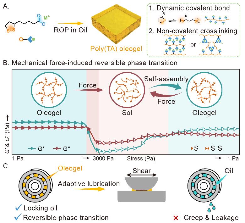 針對(duì)傳統(tǒng)潤(rùn)滑油脂在新型高端裝備應(yīng)用中面臨爬移、泄漏、粘滯阻力高等難以應(yīng)對(duì)復(fù)雜多變工況的問(wèn)題。近日,中國(guó)科學(xué)院蘭州化學(xué)物理研究所潤(rùn)滑材料全國(guó)重點(diǎn)實(shí)驗(yàn)室材料表面與界面研究組通過(guò)構(gòu)筑具有機(jī)械力響應(yīng)特性的動(dòng)態(tài)共價(jià)網(wǎng)絡(luò),開發(fā)了一類具有力誘導(dǎo)可逆相轉(zhuǎn)變能力的自適應(yīng)油凝膠潤(rùn)滑材料(PTA油凝膠)。PTA油凝膠可適應(yīng)設(shè)備啟停,在溶膠或凝膠狀態(tài)保持和迅速轉(zhuǎn)換,且具有出色的潤(rùn)滑穩(wěn)定性、適應(yīng)不斷變化的運(yùn)動(dòng)工況。