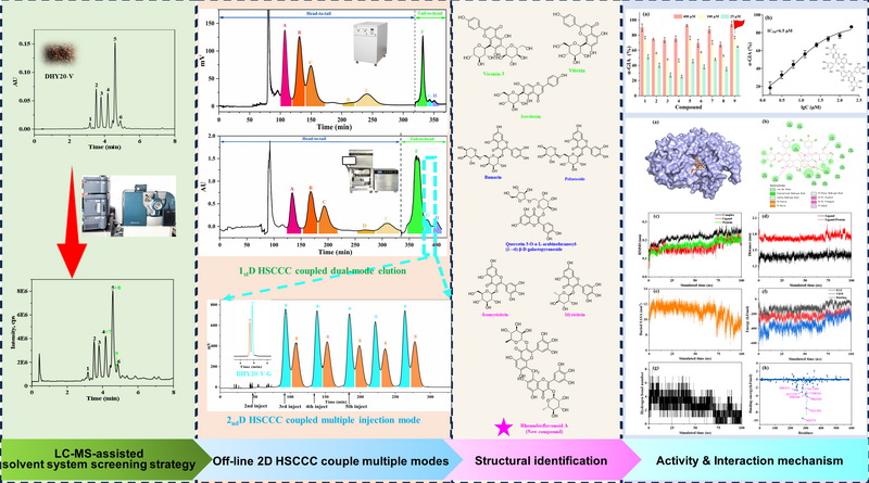 中國科學院西北高原生物研究所高原藏藥資源質(zhì)控與藥理毒理評價研究團隊通過建立離線二維高速逆流色譜結(jié)合雙模式洗脫與重復進樣連續(xù)洗脫的分離技術(shù),成功從唐古特大黃葉中分離得到1個亞甲基橋接的黃酮苷新型二聚體(Rheumbisflavonoid A)、3個黃酮碳苷和5個黃酮氧苷。Rheumbisflavonoid A的α-葡萄糖苷酶抑制活性顯著高于其余8個化合物。通過多維度的分子相互作用研究發(fā)現(xiàn),該化合物與α-葡萄糖苷酶具有高的結(jié)合常數(shù),通過范德華力和氫鍵作用占據(jù)α-葡萄糖苷酶的活性位點并形成穩(wěn)定的復合物,改變關(guān)鍵氨基酸殘基和多肽骨架的微環(huán)境,使埋藏的疏水環(huán)境暴露。此外,該化合物與α-葡萄糖苷酶結(jié)合后顯著降低其α-螺旋含量,從而使酶失去催化活性。該研究為復雜天然產(chǎn)物的分離純化及其與α-葡萄糖苷酶的相互作用機制提供了新的思路。