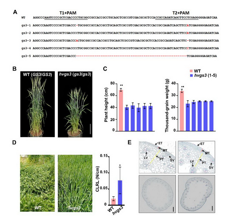 Gγ亞基在多種生物過程中發(fā)揮著重要作用,但其在大麥中的具體功能尚未完全明確。為了深入研究這一問題,中國科學(xué)院西北高原生物研究所高原作物種質(zhì)資源創(chuàng)新與利用研究團(tuán)隊利用CRISPR/Cas9技術(shù)敲除大麥品種Golden Promise中的HvGS3基因,并通過詳細(xì)的表型分析比較了突變體hvgs3與野生型之間的株高、穗長和千粒重等農(nóng)藝性狀。結(jié)果顯示,突變體hvgs3的株高比野生型降低了37.8%至43.1%,同時倒二節(jié)的抗倒伏指數(shù)提高了76.6%。進(jìn)一步分析發(fā)現(xiàn),突變體hvgs3的莖節(jié)細(xì)胞長度顯著縮短,導(dǎo)致株高降低。突變體hvgs3的木質(zhì)素合成通路被激活,木質(zhì)素含量比野生型增加了22%,基部第二節(jié)間的維管束數(shù)量、機(jī)械組織厚度均高于野生型,從而增強(qiáng)了莖稈的機(jī)械強(qiáng)度。通過CRISPR/Cas9技術(shù)成功敲除HvGS3基因,我們創(chuàng)制了一種具有矮化和抗倒伏特性的大麥新種質(zhì)資源,株高的降低和莖稈強(qiáng)度的增加共同提升了其抗倒伏性能。該研究不僅揭示了大麥HvGS3基因的功能,還為培育抗倒伏、高產(chǎn)的大麥品種提供了寶貴的理論依據(jù)和技術(shù)支持。