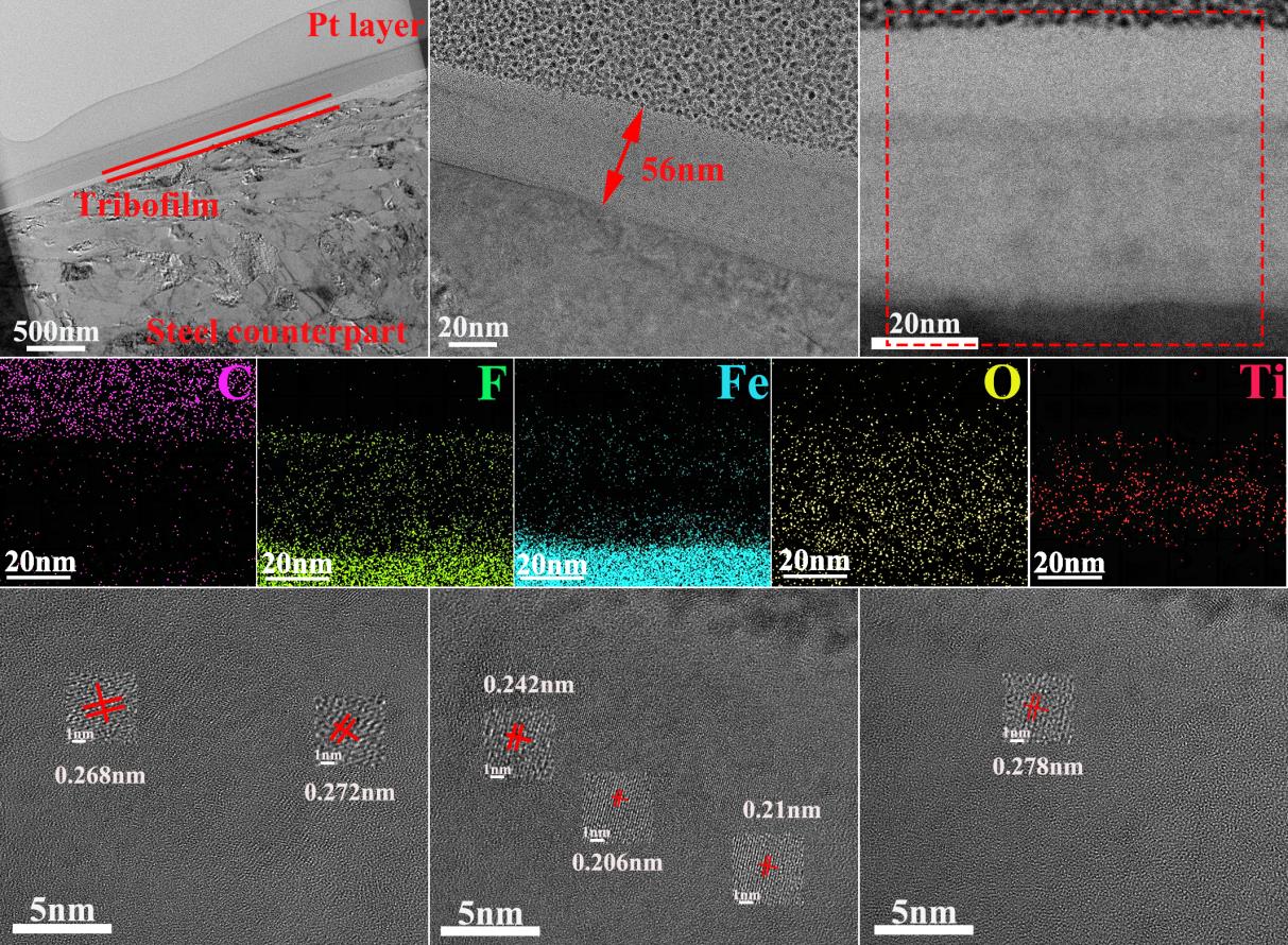 近期,針對纖維織物自潤滑復(fù)合材料摩擦學(xué)性能協(xié)同優(yōu)化的技術(shù)難題,研究團(tuán)隊基于前期研究基礎(chǔ),制備了具有核殼結(jié)構(gòu)的Ti3C2/SA/TiO2-MePCM相變微膠囊。該微膠囊以機(jī)械強(qiáng)度優(yōu)異的二氧化鈦為殼層增強(qiáng)復(fù)合材料力學(xué)性能,內(nèi)核正二十二烷通過相變作用吸收摩擦熱并實現(xiàn)局部固-液協(xié)同潤滑,同時二維材料Ti3C2Tx憑借其層間滑移特性和高承載能力有效降低復(fù)合材料的摩擦損傷。實驗數(shù)據(jù)表明,引入該微膠囊后纖維織物自潤滑復(fù)合材料的摩擦系數(shù)由0.053降至0.046,磨損率由8.9×10-14m3 (N·m)-1顯著降低至3.5×10-14m3(N·m)-1。研究團(tuán)隊通過多種表征技術(shù)系統(tǒng)解析了摩擦膜的微觀形貌演變規(guī)律,闡明了織物復(fù)合材料的減摩抗磨作用機(jī)制,為核殼結(jié)構(gòu)材料在摩擦學(xué)領(lǐng)域的創(chuàng)新應(yīng)用提供了理論支撐。