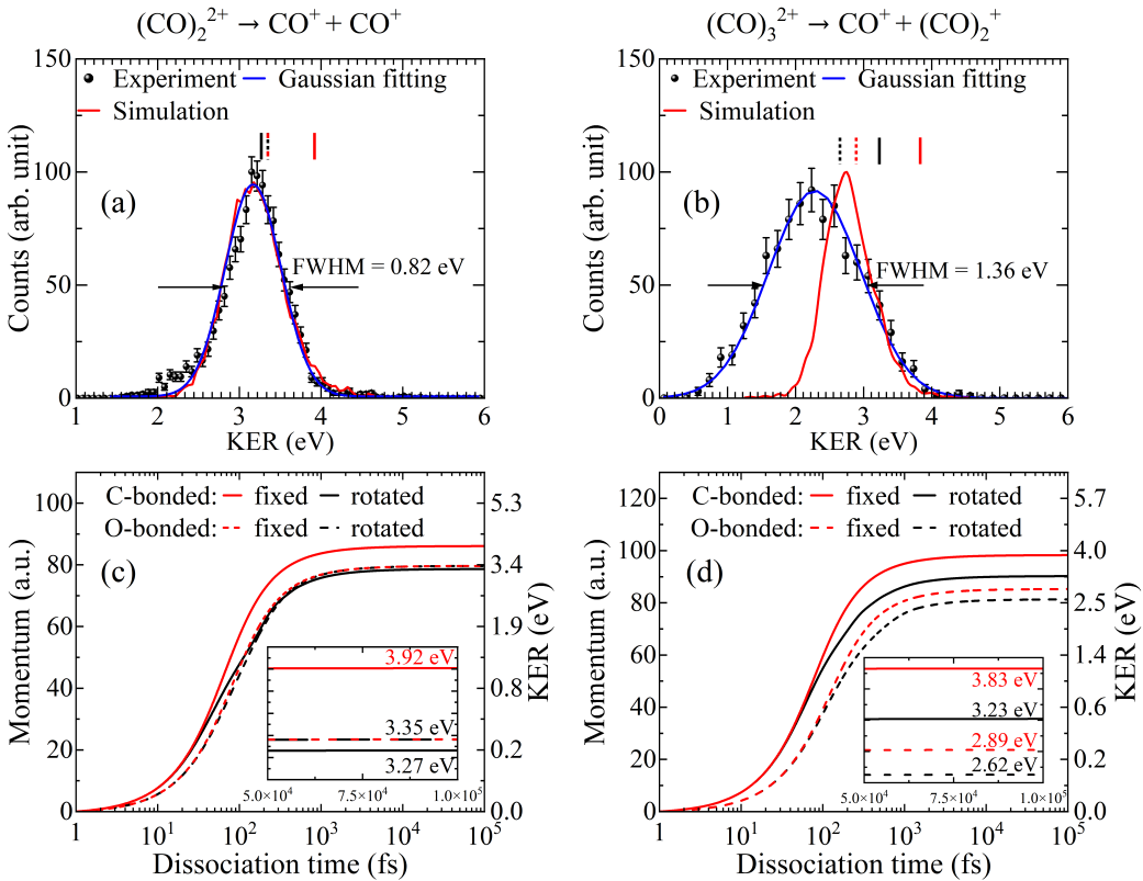 為了解釋這一實(shí)驗(yàn)現(xiàn)象,科研人員在傳統(tǒng)的點(diǎn)電荷模型基礎(chǔ)上,引入了更高階的電荷分布模型,并特別考慮了CO+的電荷分布和電偶極矩。結(jié)果表明,偶極作用誘導(dǎo)了CO?碎片的轉(zhuǎn)動激發(fā)。這種能量傳遞機(jī)制充分解釋了實(shí)驗(yàn)與理論之間的差異,同時(shí)揭示了庫倫爆炸過程偶極相互作用誘導(dǎo)的CO?碎化。